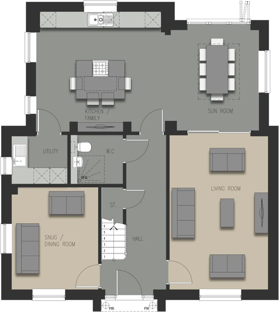 The covered porch entrance opens into a spacious hallway which leads into a large living room, dual aspect snug, and airy open plan kitchen/family room.